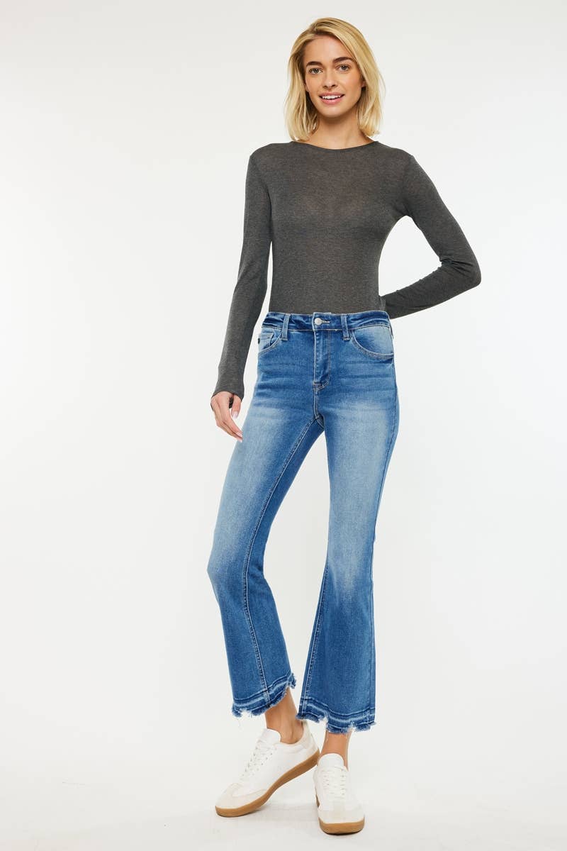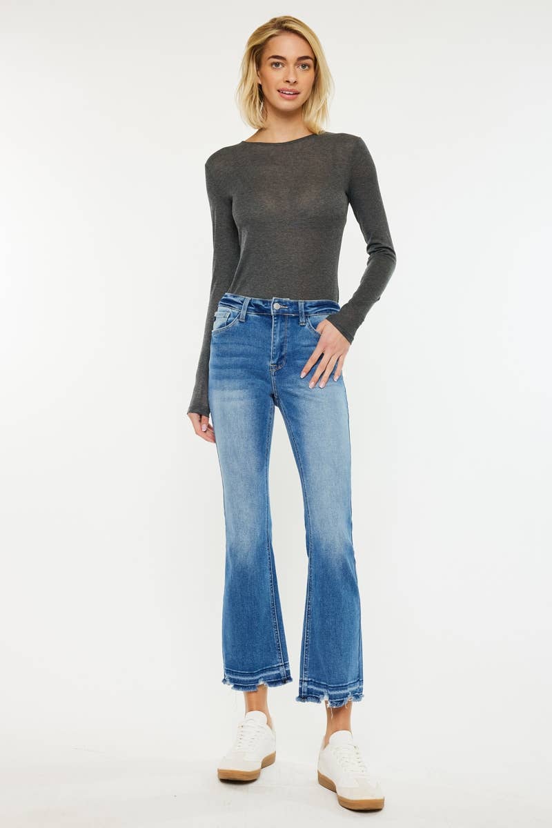 HIGH RISE CROP BOOTCUT JEANS MEDIUM WASH STRETCH RELEASED HEM 5 POCKET ZIPPER FLY RISE 10” INSEAM 27“ IN SIZE 5/26 75% COTTON, 23% TENCEL, 2% SPANDEX 13.5 OZ