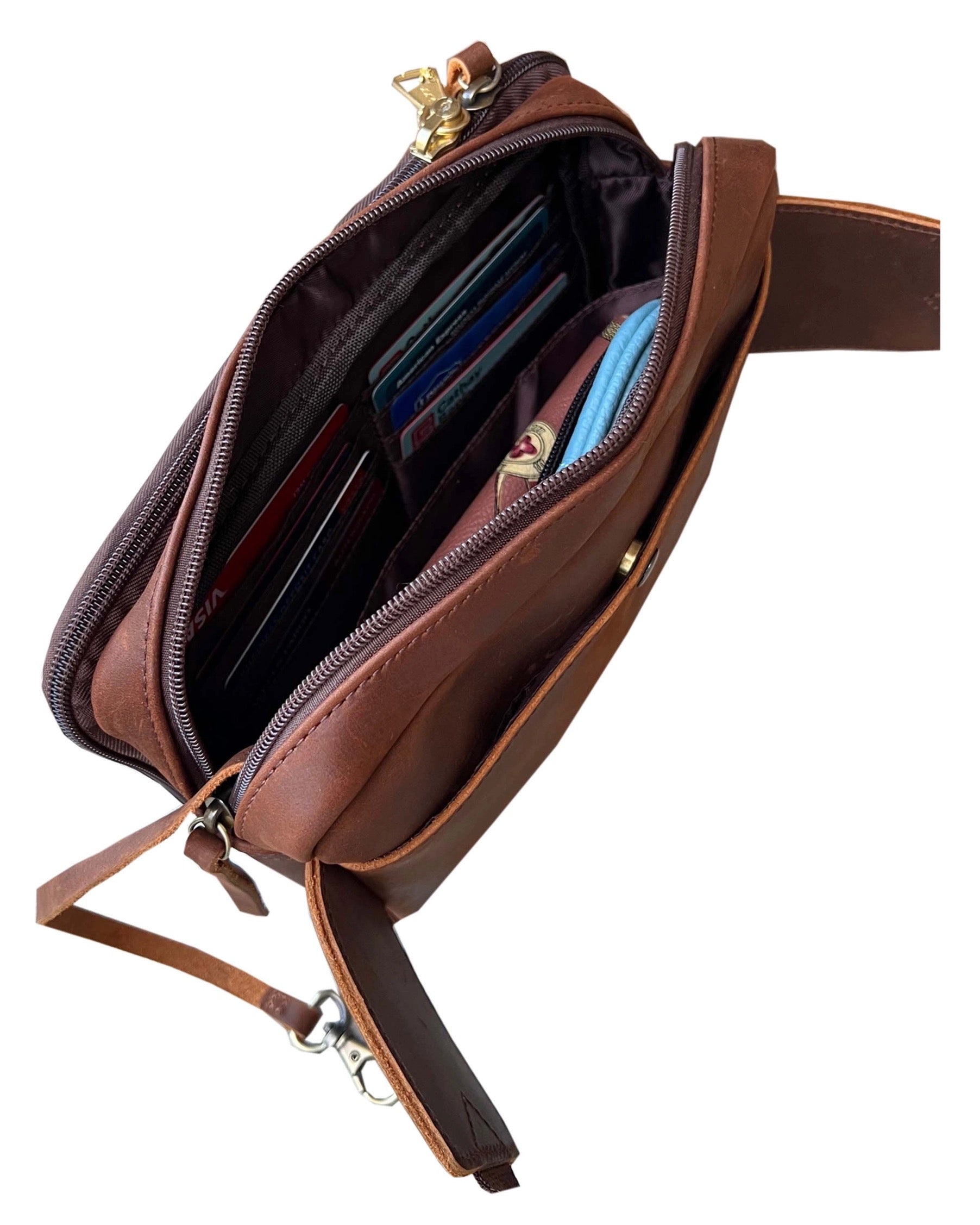 This Vintage Leather universal Waist /sling pack is the ideal fanny pack for anyone on-the-go. -There are 2 main compartments include a pocket with YKK zipper(with 1 set of keys) on the top. - A zipper pocket on the front and a snap pocket on the back. -The heavy-duty nylon belt strap is made with a Snap-On buckle making it easy to put on and remove the pack. Material: Vintage Leather Size: 9”L X 6”H X 3”W Color: Brown